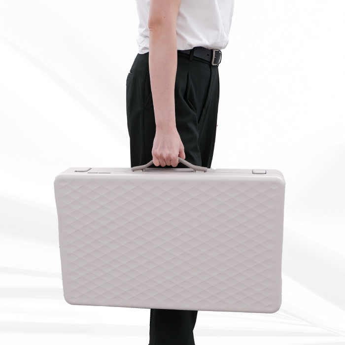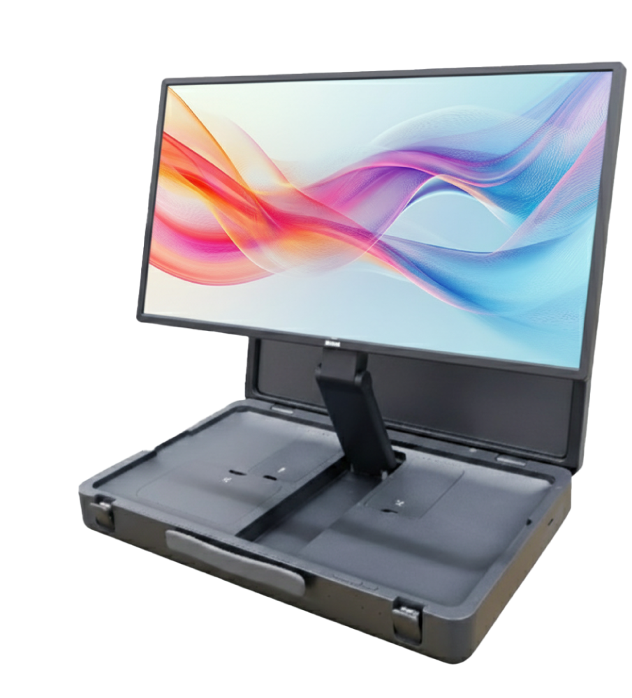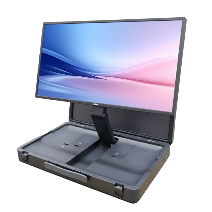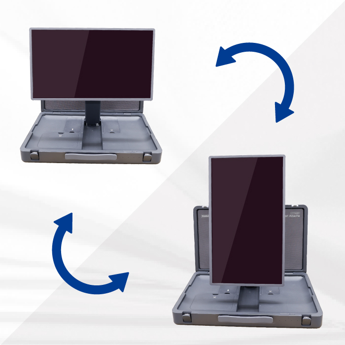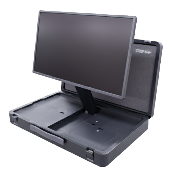 アタッシュケース型のコンパクト設計なので、持ち運びが非常に簡単です。設置もシンプルで、平らな場所に置いてロックを解除し、ディスプレイを持ち上げるだけで完了します。