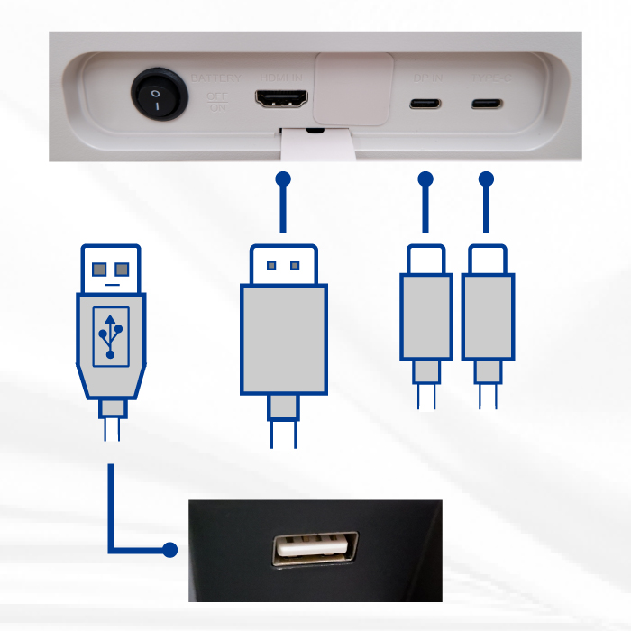 HDMIのほか、USB Type-CやDisplayPortを搭載しており、PCなどと接続し外部ディスプレイとしてご使用いただけます。また、USB Type-Aも利用可能です。