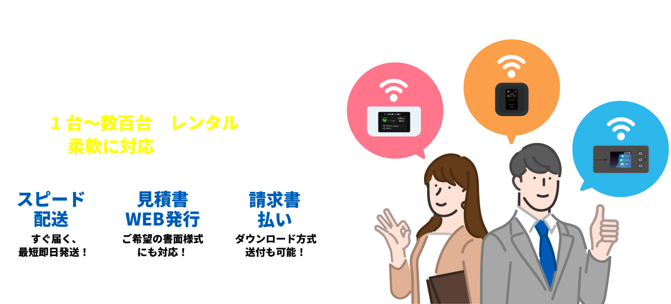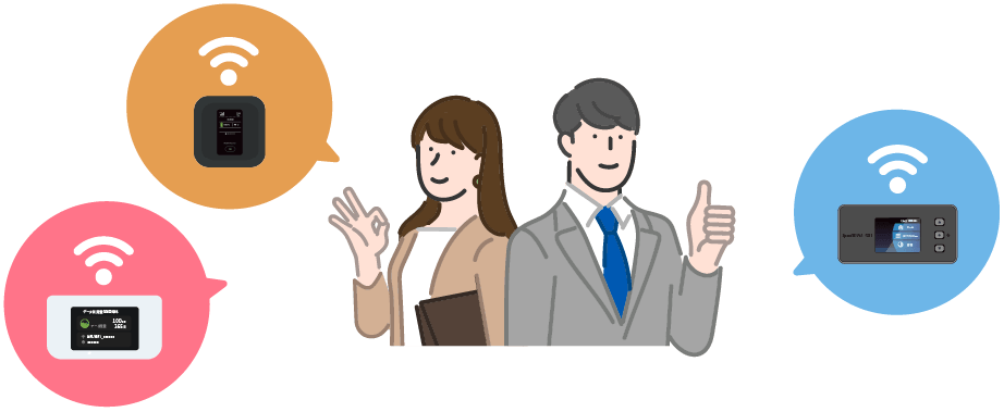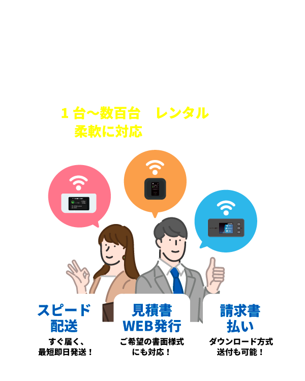 WiFiレンタルの実績豊富な専任の法人担当が、お客さまのご利用用途やご予算に応じて、30種類以上の豊富な商品ラインナップの中から、最適な機種・プランをご案内いたします。配送方法、納期、予算、台数等、しっかりサポートいたしますので、まずは、お気軽にご相談ください!